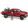 Le RAM est conçu pour le transport tout-terrain et peut accueillir sans problème la Ducati sur sa plateforme de chargement. Sa robustesse et ses aptitudes tout-terrain sont légendaires et uniques. Ce véhicule se montre aussi impressionnant au niveau des performances. Son moteur V8 HEMI affiche une puissance de 410 CV et atteint un couple de 582 Newton-mètres. Toutes les portières peuvent être ouvertes et la cabine peut contenir 4 figurines bworld. Pour plus de confort de conduite et de manœuvrabilité, ce modèle à l’échelle 1:16 est équipé d’essieux à ressorts et l’essieu avant peut être dirigé grâce à la prolongation du volant incluse. Le modèle de la Ducati reprend fidèlement à l’échelle des éléments de design tels que les roues à rayons métalliques, le pot d’échappement ou les éléments de motocross. Comme l’original, le modèle BRUDER dispose d’une suspension arrière. La Ducati peut être fixée sur la plateforme de chargement par le conducteur parfaitement équipé grâce aux supports de transport inclus