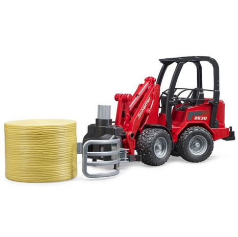 Cette chargeuse articulée compacte Bruder Schaffer 2034 est livrée avec un godet, une pince à balles et une balle ronde. Une vraie aide agricole.