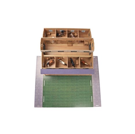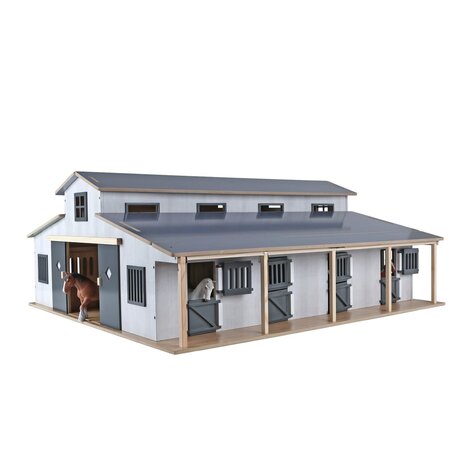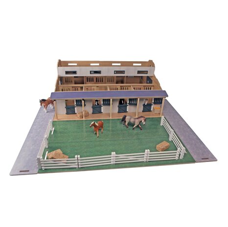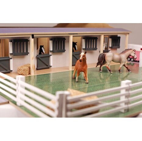 De stal is gebouwd op een schaal van 1:24 en heeft zeven paardenboxen, elk voorzien van een eigen deur.