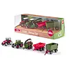 Deze set bevat gedetailleerde miniaturen van landbouwvoertuigen en aanhangers: